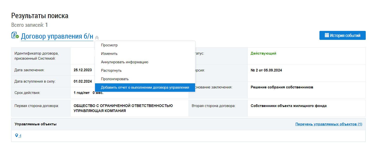 Авторизуйтесь на ГИС ЖКХ и нажмите кнопку «Добавить отчет о выполнении договора управления» под нужным договором.