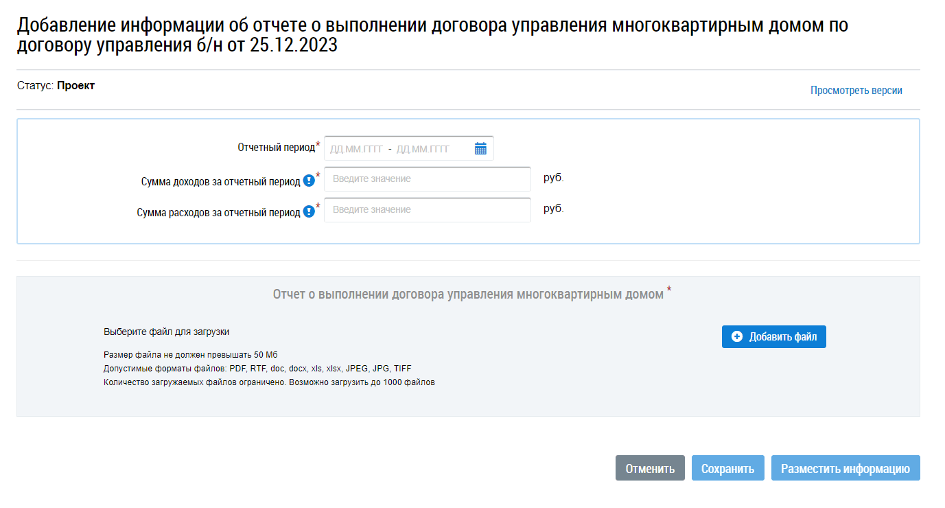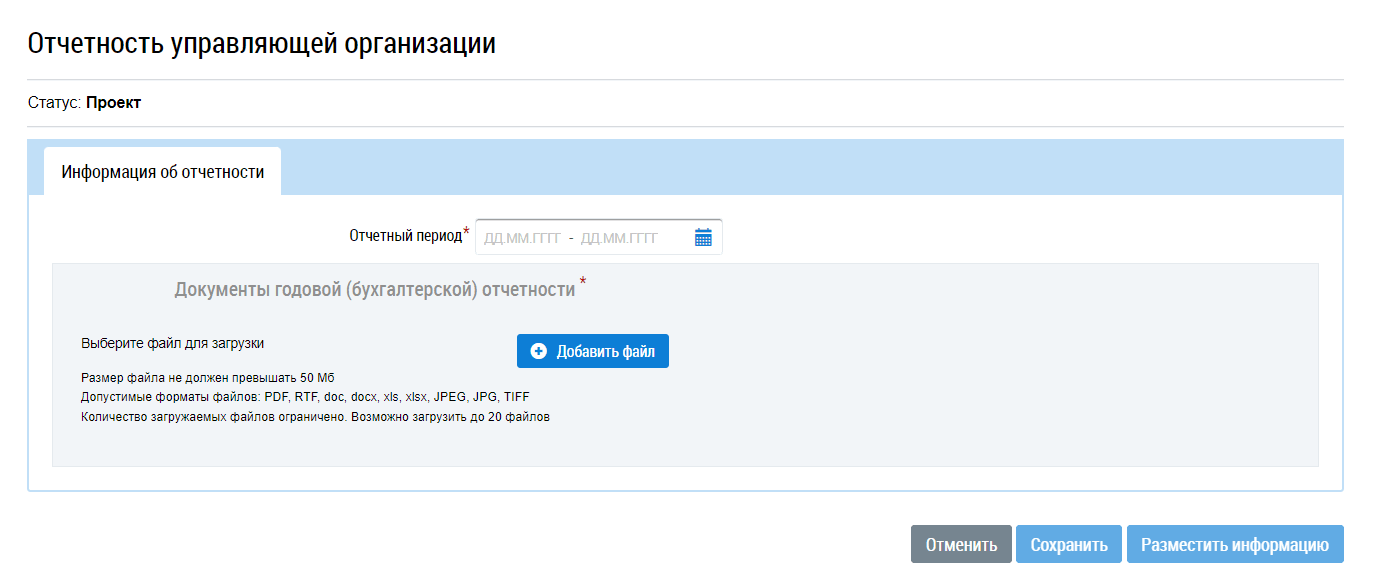 Откроется страница «Отчетность управляющей организации». Укажите на ней отчетный период, сумму доходов и расходов. Добавьте сам годовой отчет в формате PDF, RTF, doc, docx, xls, xlsx, JPEG, JPG, TIFF.