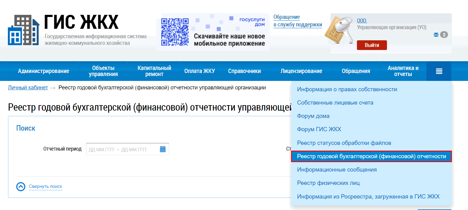 Нажмите в правом верхнем углу пиктограмму выпадающего списка (4 горизонтальные полоски) – пункт меню «Реестр годовой бухгалтерской (финансовой) отчетности управляющей организации». Откроется соответствующая страница.