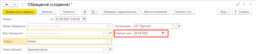 Исходя из указанного количества дней в обращении автоматически проставляется крайний срок рассмотрения обращения (можно при необходимости поменять):