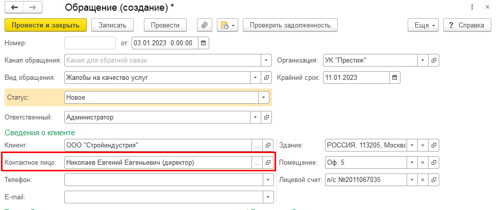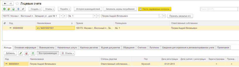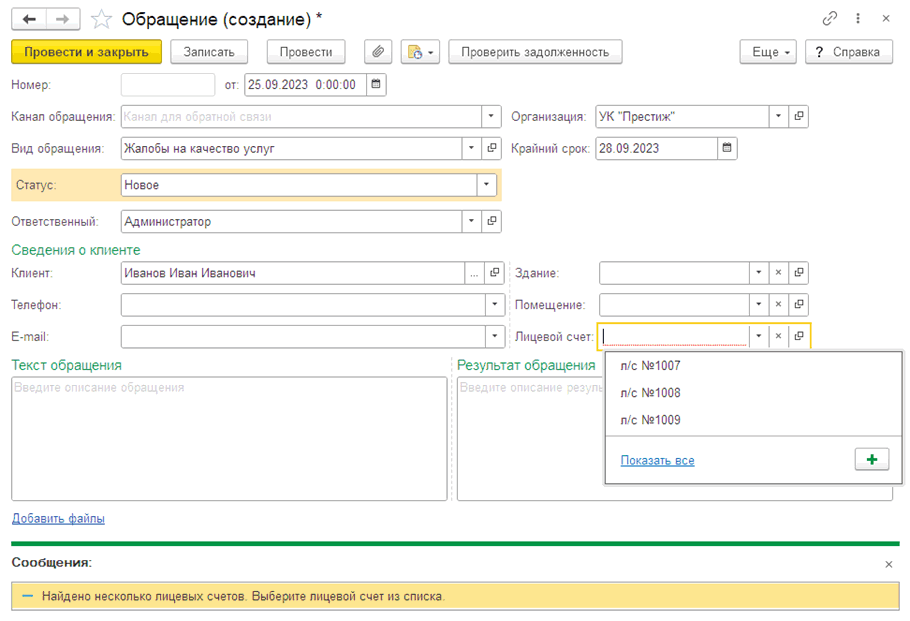 Если выбранный клиент является владельцем или жильцом одного из имеющихся лицевых счетов, то поля «Здание», «Помещение» и «Лицевой счет» заполняются автоматически;