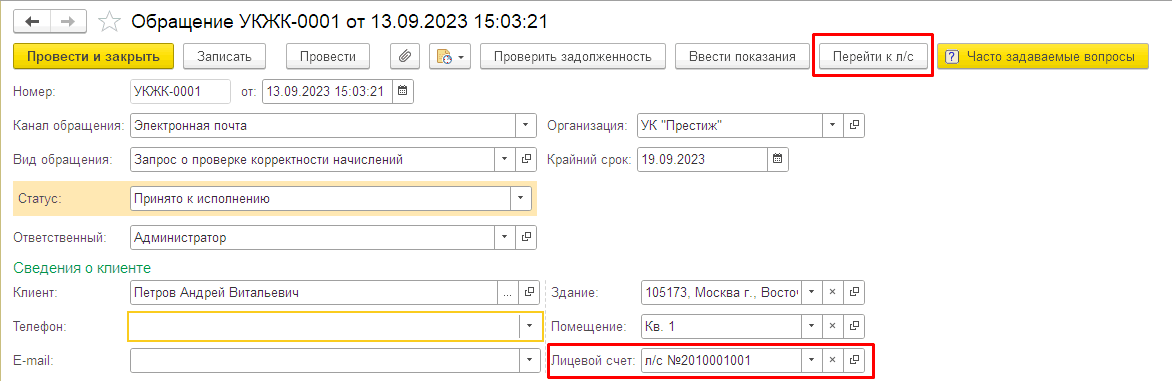 Для быстрого перехода в лицевой счет, который указан в обращении, можно воспользоваться кнопкой «Перейти к л/с»: