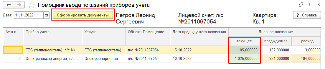 В открывшемся помощнике вводим текущие показания, переданные жильцом, и нажимаем на кнопку «Сформировать документы»: