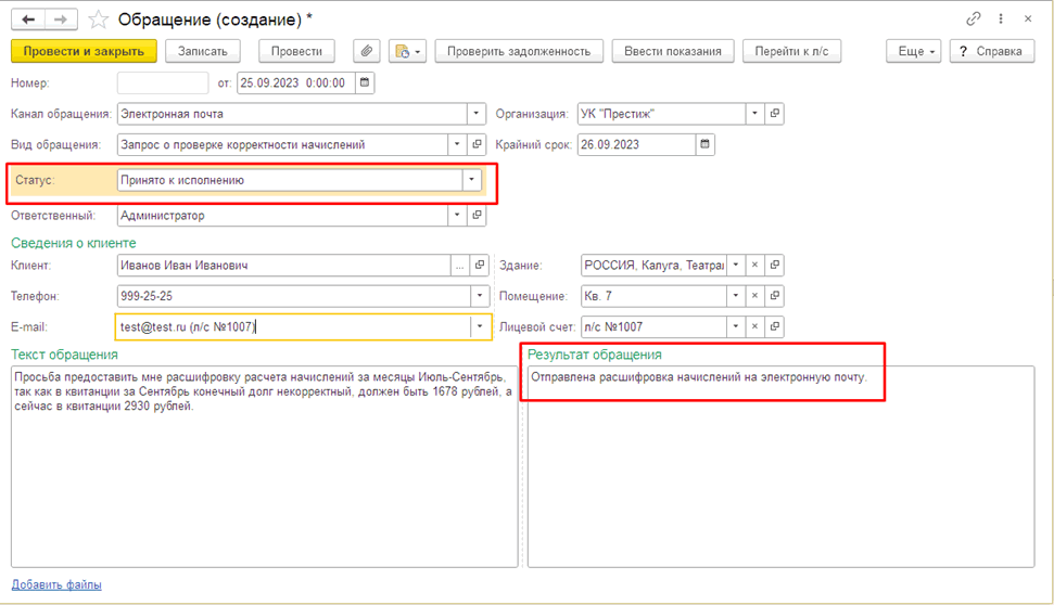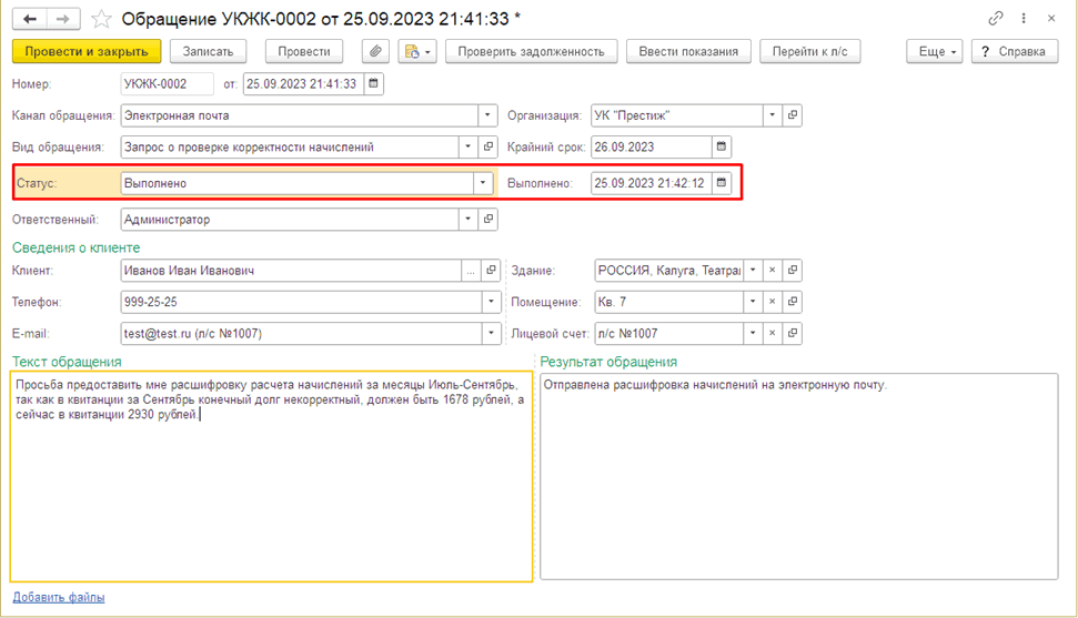 Передаем результаты рассмотрения вопросы жильцу по удобному для него каналу связи (например, по электронной почте). После этого меняем статус на «Выполнено». При этом автоматически проставляется дата выполнения обращения (текущая дата, можно поменять):