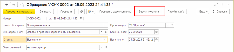 При помощи обращений можно также зафиксировать факт подачи жильцами показаний счетчика (например, по телефону). При этом по кнопке «Ввести показания» можно быстро создать документ для ввода показаний по данному лицевому счету: