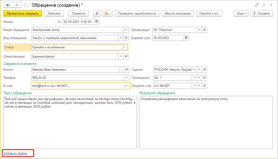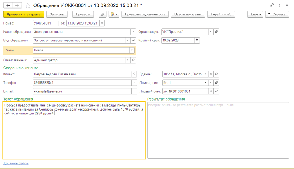 Прикрепленные файлы – если клиент отправил бумажные документы или фотографию квитанции, то к обращению прикрепляется файл квитанции;