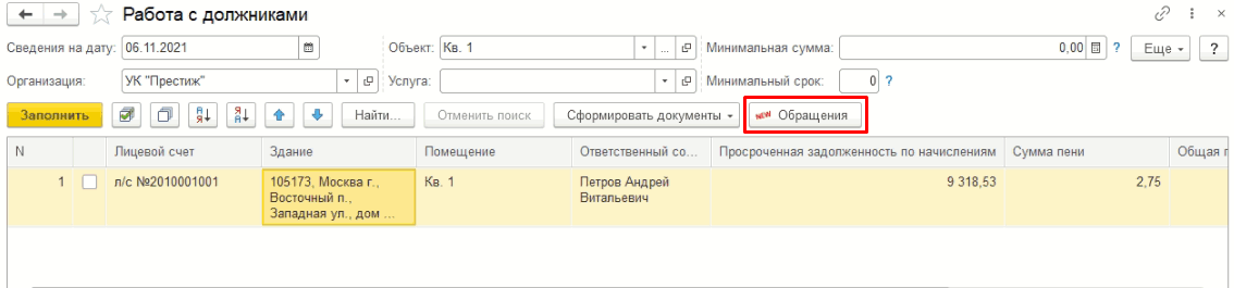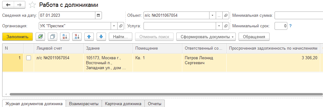 При этом открывается журнал «Работа с должниками» с отбором по указанному в обращении лицевому счету: