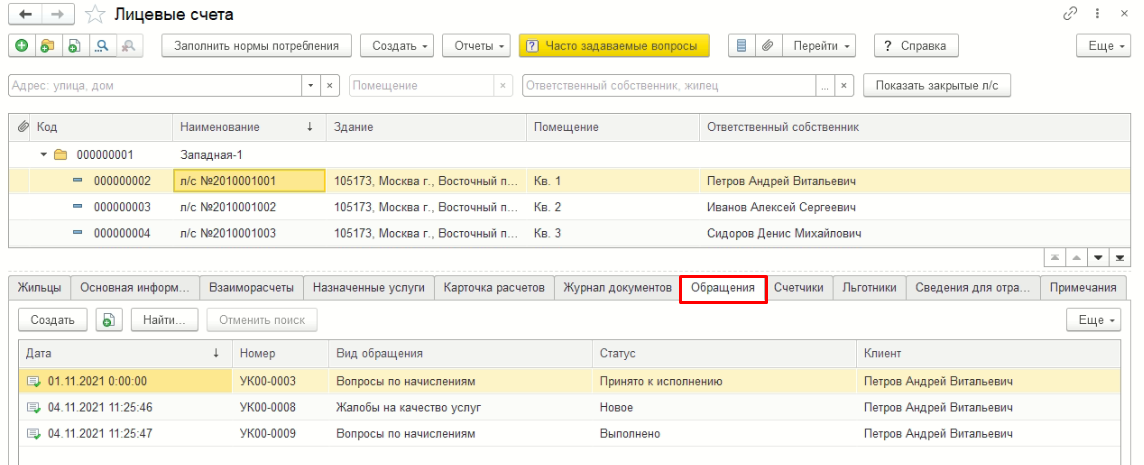 Все обращения по конкретному лицевому счету можно также увидеть: