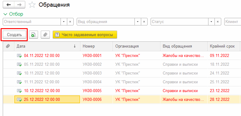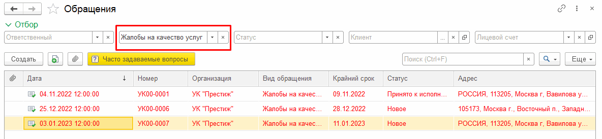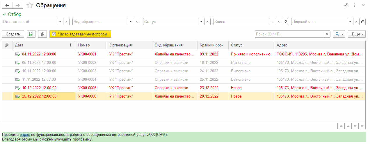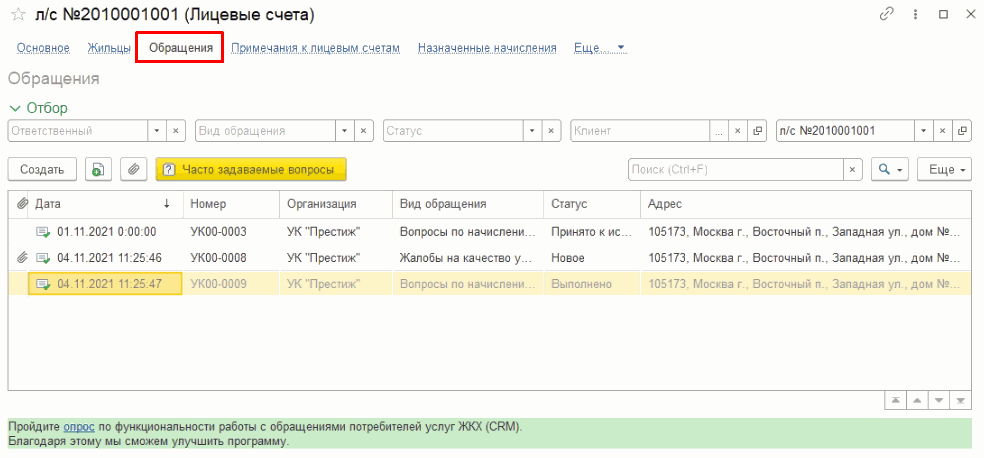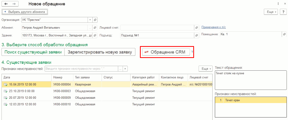 В программе «1С:Учет в управляющих компаниях ЖКХ, ТСЖ и ЖСК» реализован функционал для работы с обращениями жильцов, доступный в подсистеме CRM: