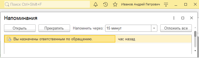 При регистрации обращения можно указать в качестве ответственного другого сотрудника (например, зарегистрировал обращение сотрудник «Администратор», указав ответственным сотрудника «Иванов Андрей Петрович». У ответственного сотрудника при этом автоматически появится уведомление о назначении ему обращения: