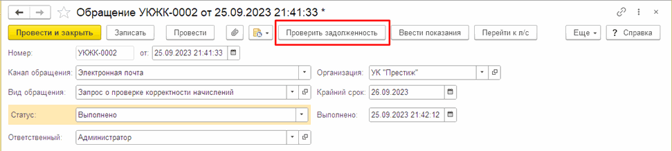 Для более быстрой и удобной обработки обращений от жильцов с вопросами о задолженности прямо из документа можно проверить задолженность по лицевому счету, нажав на соответствующую кнопку: