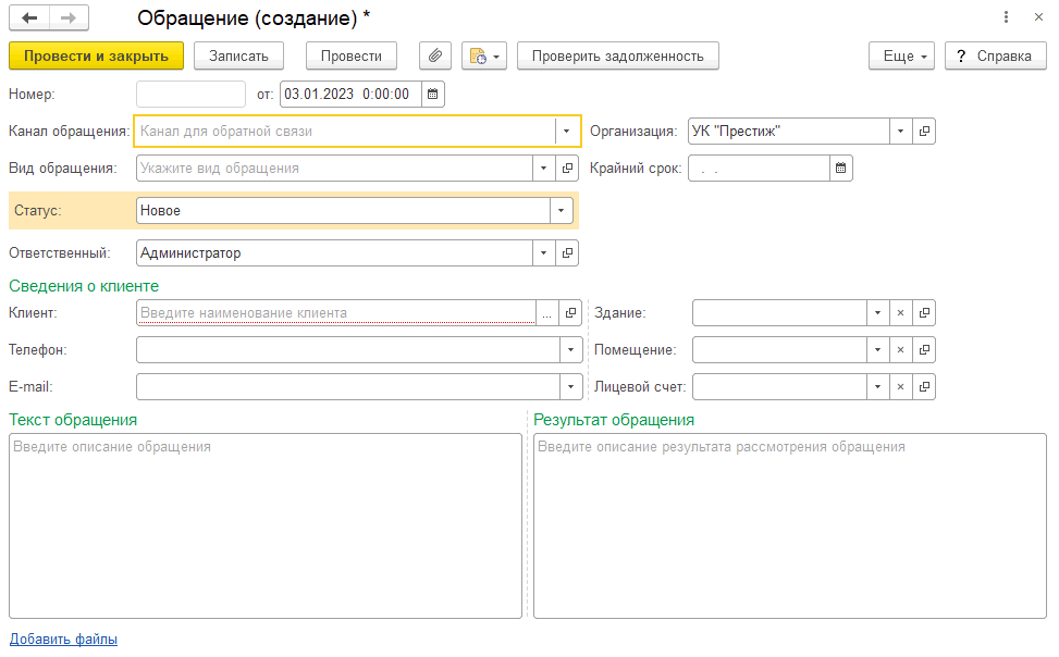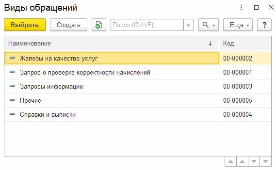 Вид обращения – категория обращения. Основные категории обращений (например, Вопросы по начислениям) хранятся в отдельном справочнике, который можно пополнить своими вариантами: