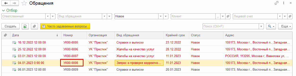 Для обработки накопившихся обращений сотрудник УК в списке обращений отбирает обращения со статусом «Новое», в список в т.ч. попадает обращение 0008: