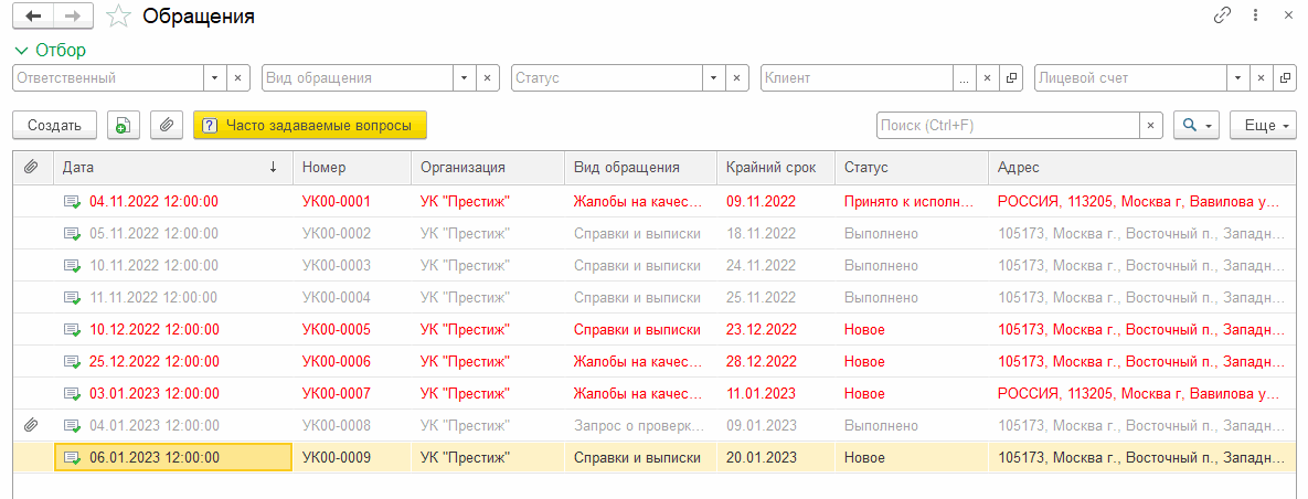 Выполненные обращения в списке помечены серым цветом, невыполненные, но срок рассмотрения которых еще не истек – черным, обращения, срок рассмотрения которых истек или подходит к концу (за 3 рабочих дня) – красным: