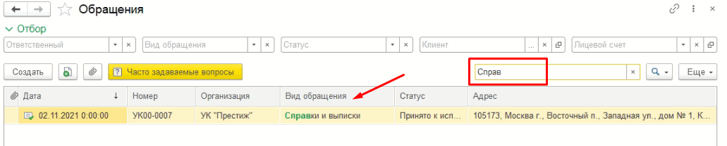 Также доступен быстрый поиск в соответствующем поле, например, можно ввести часть адреса или вида обращения: