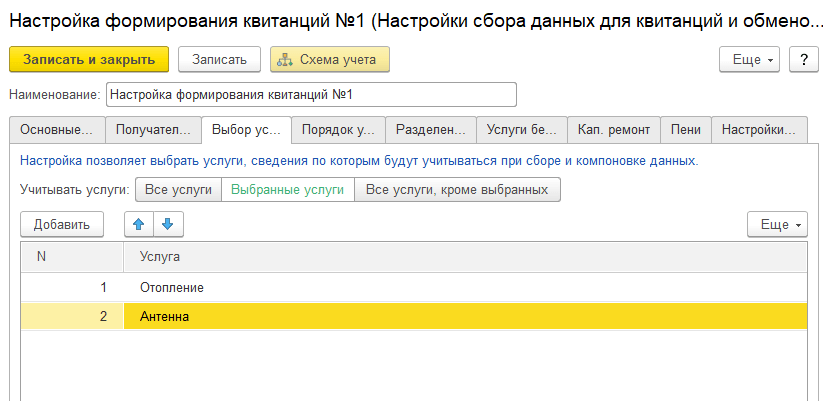 В настройке указаны услуги «Отопление» и «Антенна», в квитанцию попадут все услуги, по которым были начисления, кроме этих:
