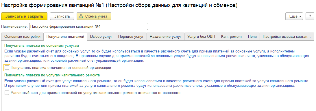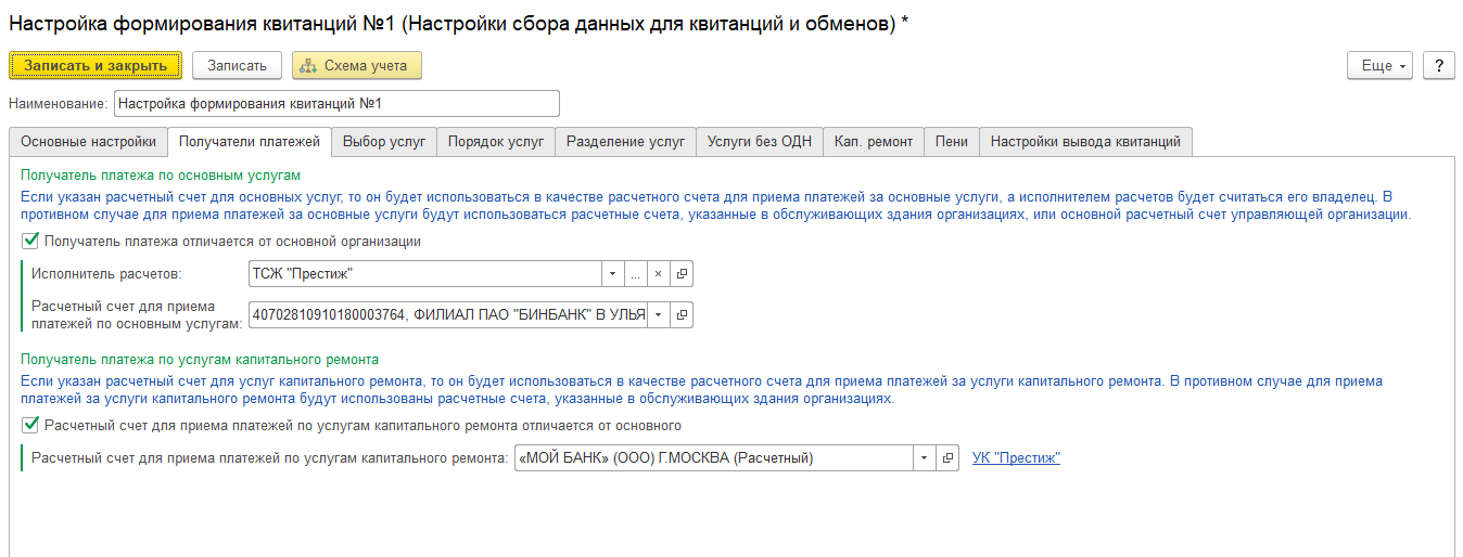 Если же получатель платежа или расчетный счет отличаются от основного (основной организации), то на данной закладке указываются действующие данные для приема платежей по основным услугам и услугам капитального ремонта соответственно: