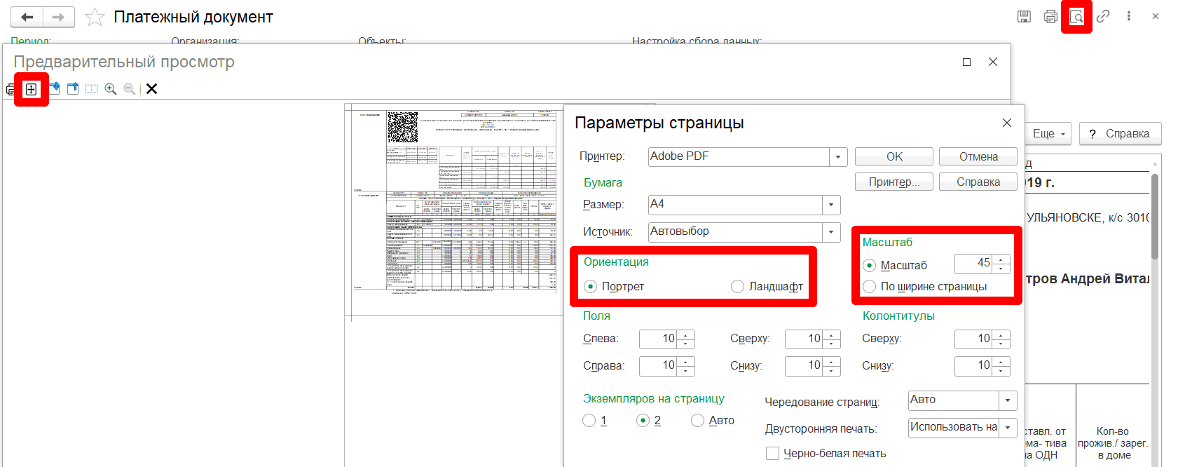 В предварительном просмотре печати, в настройках параметров страницы есть возможность уменьшить масштаб квитанции, либо изменить ориентацию страницы, чтобы уменьшить объем квитанции и распечатать две квитанции на одном листе.