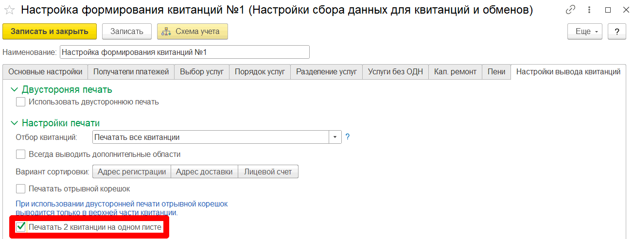 Флаг «Печатать 2 квитанции на одном листе» – при установке флага выполняется печать двух квитанций на одном листе по разным лицевым счетам. При этом, в случае «большого» объема квитанций (без возможности расположения двух квитанций на одном листе), они будут печататься на разных листах.