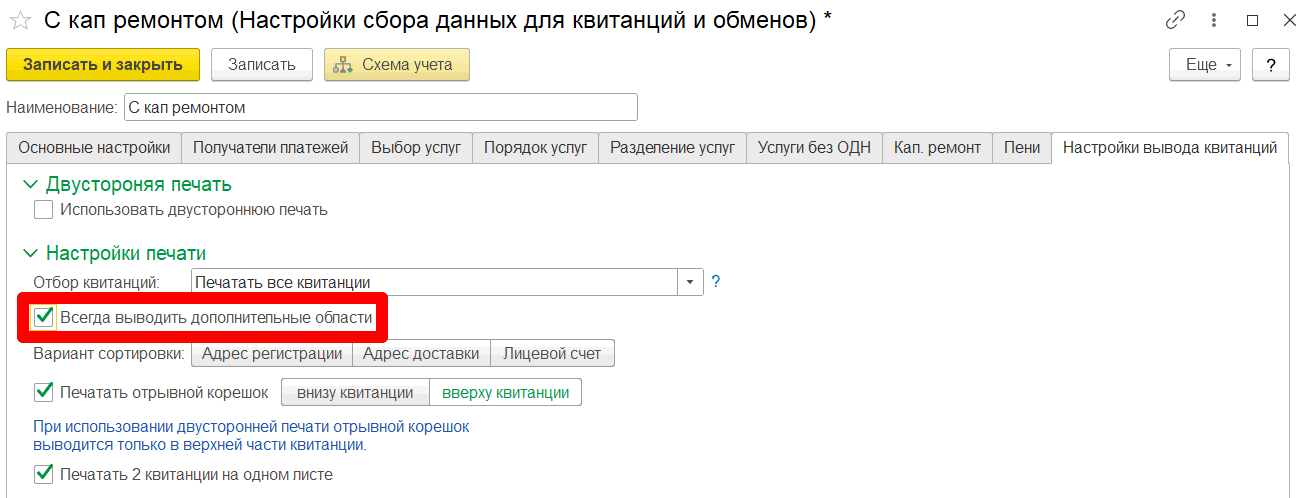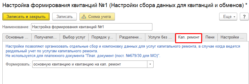 На данной закладке можно настроить печать отдельной квитанции на услуги, относящиеся к капитальному ремонту. Более подробно о данной возможности можно посмотреть в данной инструкции.