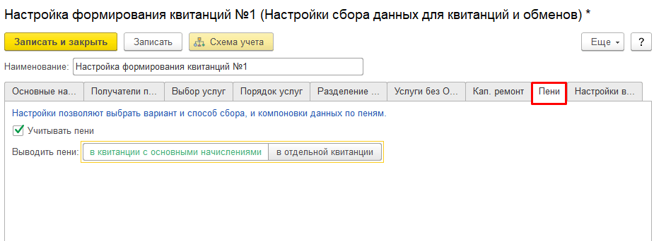 На данной закладке настраивается вывод сумм начисленных пени в квитанции.