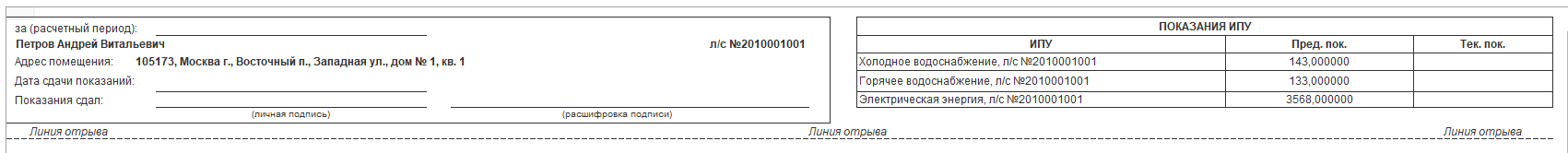 Флаг «Печатать отрывной корешок» – устанавливает факт вывода отрывной части квитанций с информацией о последних показаниях индивидуальных приборов учета: