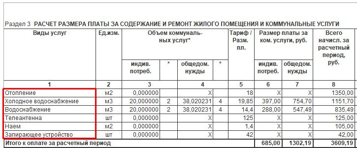 Например, если услуга в списке не указана, индивидуальные начисления и ОДН будут выводиться в отдельных колонках: