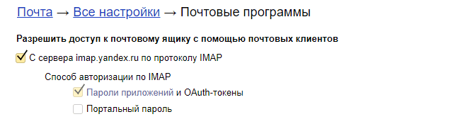 Перед настройкой почтовой программы включите работу протокола IMAP в веб интерфейсе почты Яндекс: