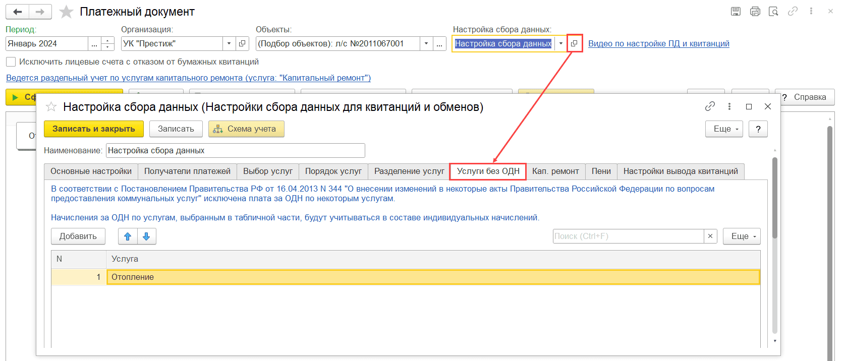 6) Откроем отчет «Платежный документ» (в примере рассматривается форма квитанции «Плат. документ (приказ №454 в соответ. с пост. №354)»), откроем настройку сбора данных и в настройках отчета на вкладке «Услуги без ОДН» укажем услугу, начисления за ОДН по которой будут выводиться в составе индивидуальных начислений: