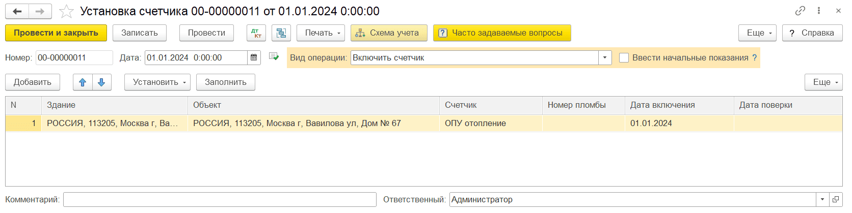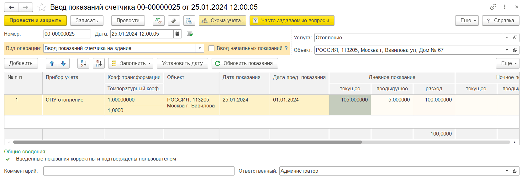 4) Создадим документы «Ввод показаний счетчика» с видом операции «Ввод показаний счетчика на здание» – ввод начальных показаний и ввод показаний в конце периода начисления соответственно: