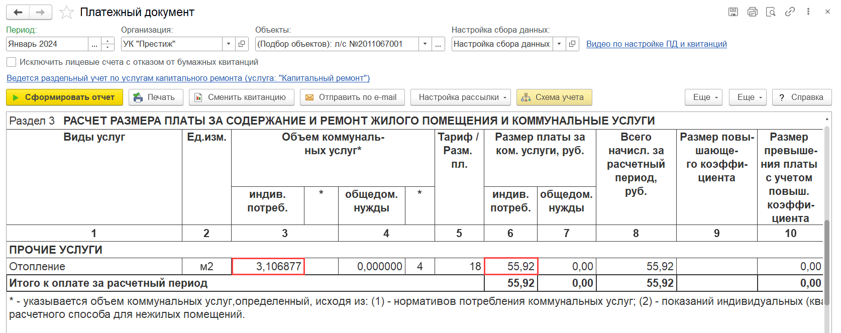 Как видно из платежного документа, начисление по услуге «Отопление» отражается в колонках «индивидуальное потребление». Количество индивидуального потребления по услуге «Отопление» – 3,3106877, размер платы за индивидуальное потребление по услуге «Отопление» – 55,92.