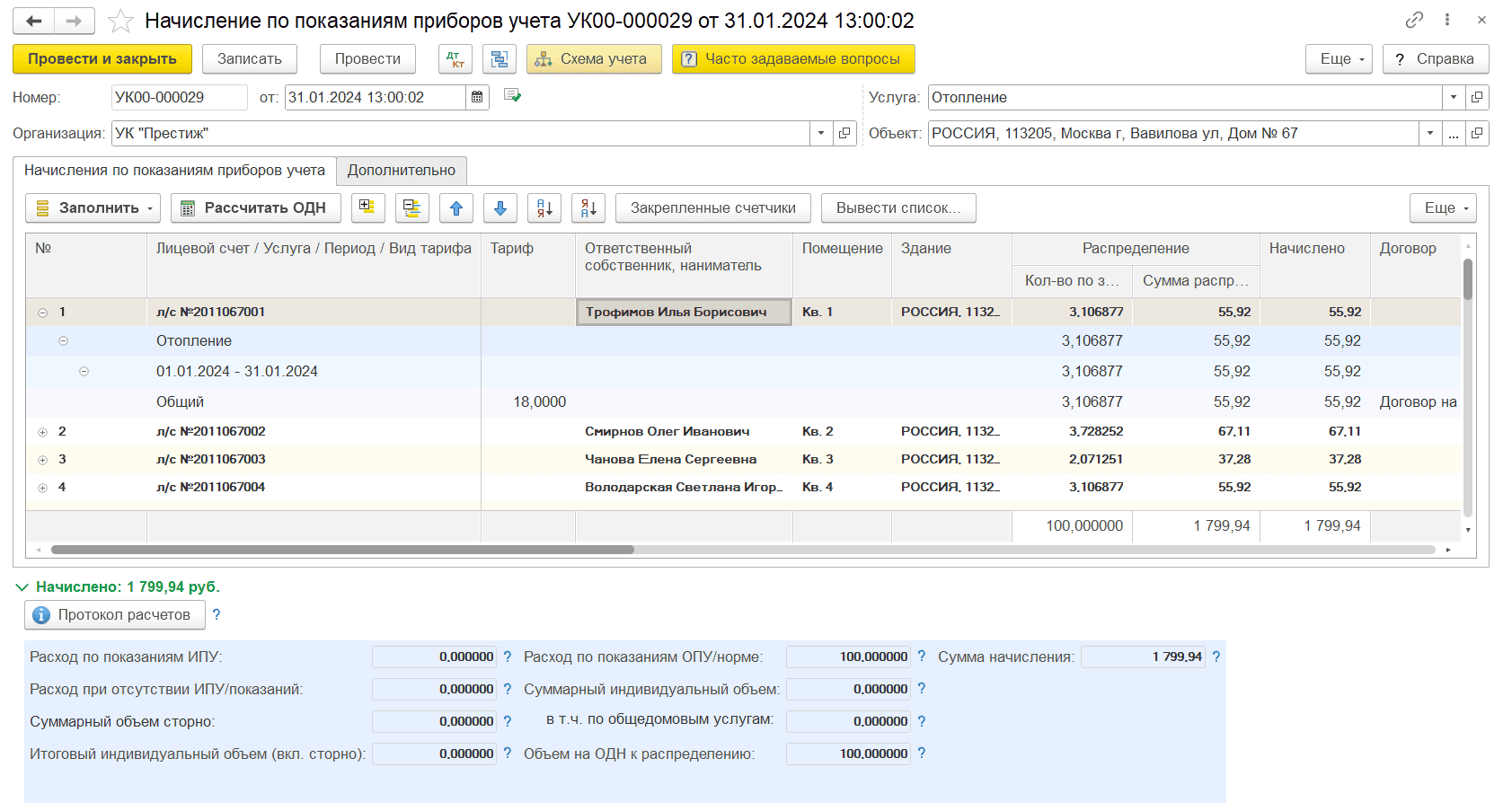 Рассмотрим реализацию данной возможности в программе 1С: Учет в управляющих компаниях ЖКХ, ТСЖ и ЖСК вер. 3.0 на примере услуги «Отопление» для жильца Трофимова Ильи.