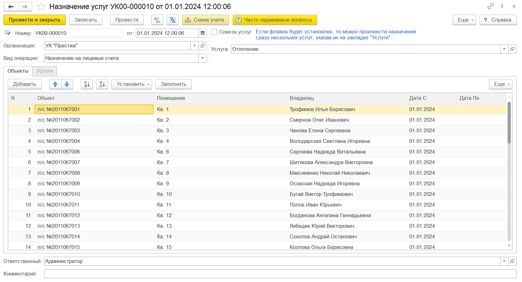 2) Назначим услугу на лицевые счета с помощью документа «Назначение услуг»: