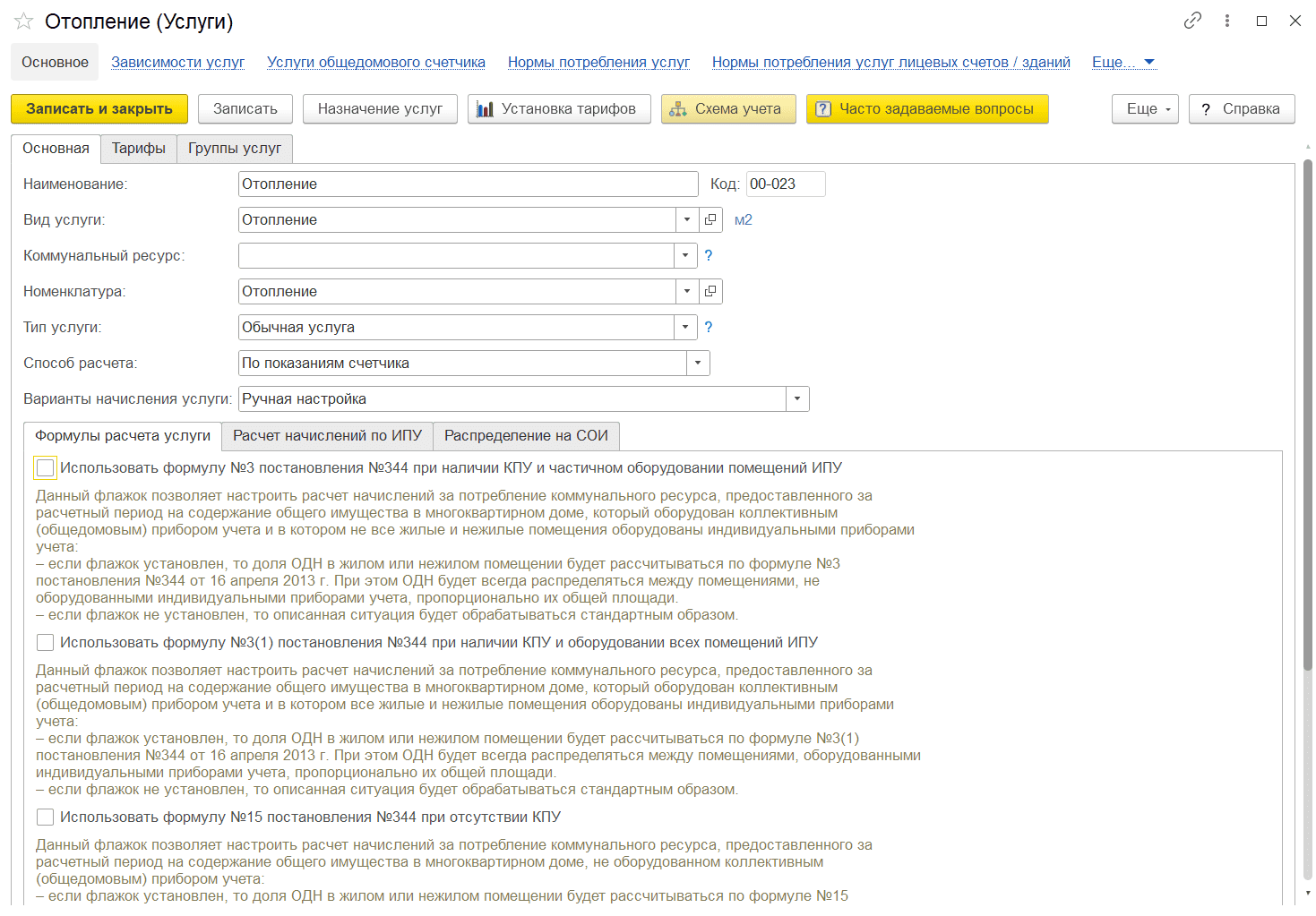 1) Создадим услугу «Отопление» с видом услуги «Отопление» со способом расчета «По показаниям счетчика»: