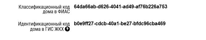 Бывают случаи, когда зданию в ГИС ЖКХ присвоены несколько кодов: Классификационный код дома в ФИАС и Идентификационный код дома в ГИС ЖКХ (код временного адреса). В таких случаях рекомендуется выбрать Идентификационный код дома в ГИС ЖКХ, если он отмечен жирным шрифтом: