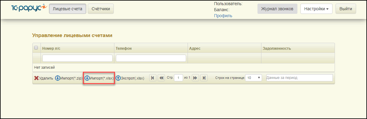 Для этого необходимо авторизоваться в личном кабинете. Перейти в раздел «Управление лицевыми счетами», нажать на кнопку «Импорт(.xlsx)» и выбрать сохраненный файл: