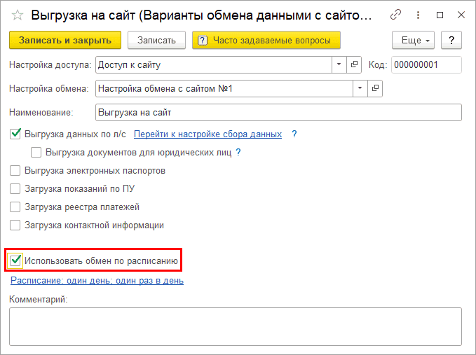 В справочнике «Варианты обмена» установите флаг «Использовать обмен по расписанию»: