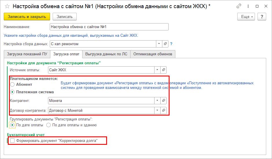 Платежная система – плательщиком является платежная система. При обмене будет создаваться документ «Регистрация оплаты» с видом операции «Поступление из автоматизированных систем приема оплаты». Дополнительно можно установить флаг «Формировать документ Корректировка долга» для проведения взаимозачета между платежной системой и абонентом. Этот документ можно создать и позднее, из документа «Регистрация оплаты» по кнопке «Документы оплаты → Отразить оплаты»: