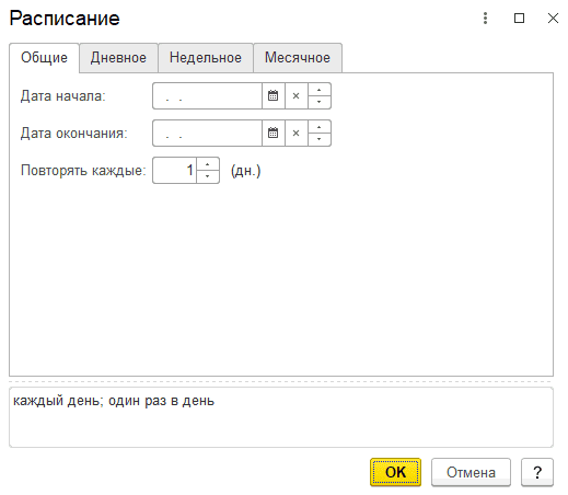 На вкладке «Общие» укажите дату начала и окончания расписания, количество дней для повторения, например, повторять каждые 1 день: