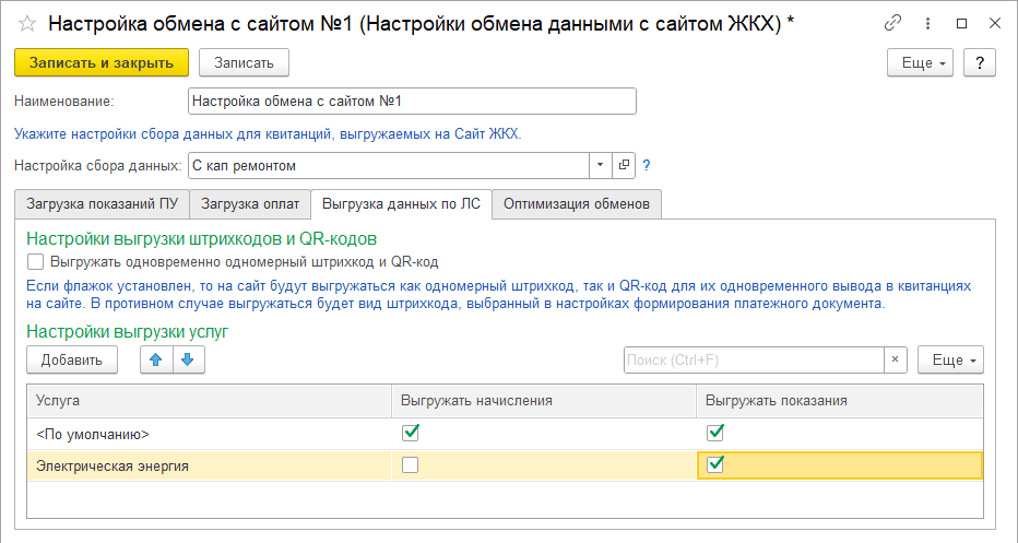 При такой настройке по услуге «Электрическая энергия» будут выгружаться показания и не будут выгружаться начисления. По остальным услугам будут выгружаться и начисления, и показания.