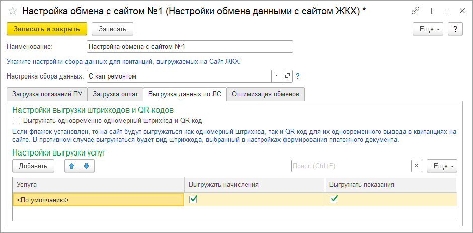 Настройки выгрузки услуг – укажите настройки выгрузки данных о начислениях и показаниях счетчиков в разрезе услуг: