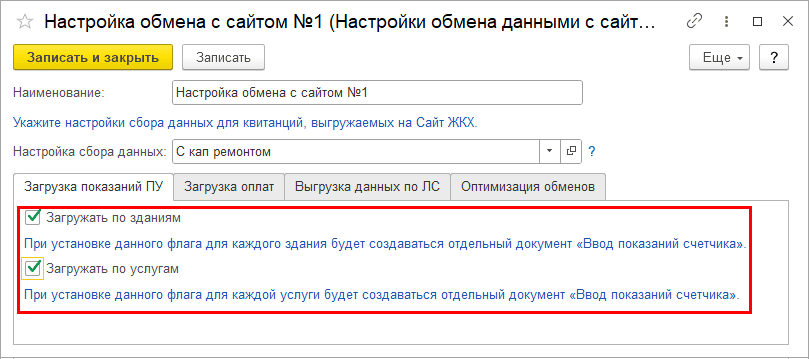 Флаг «Загружать по зданиям» – если нужно, чтобы документы «Ввод показаний счетчика» создавались в разрезе зданий.