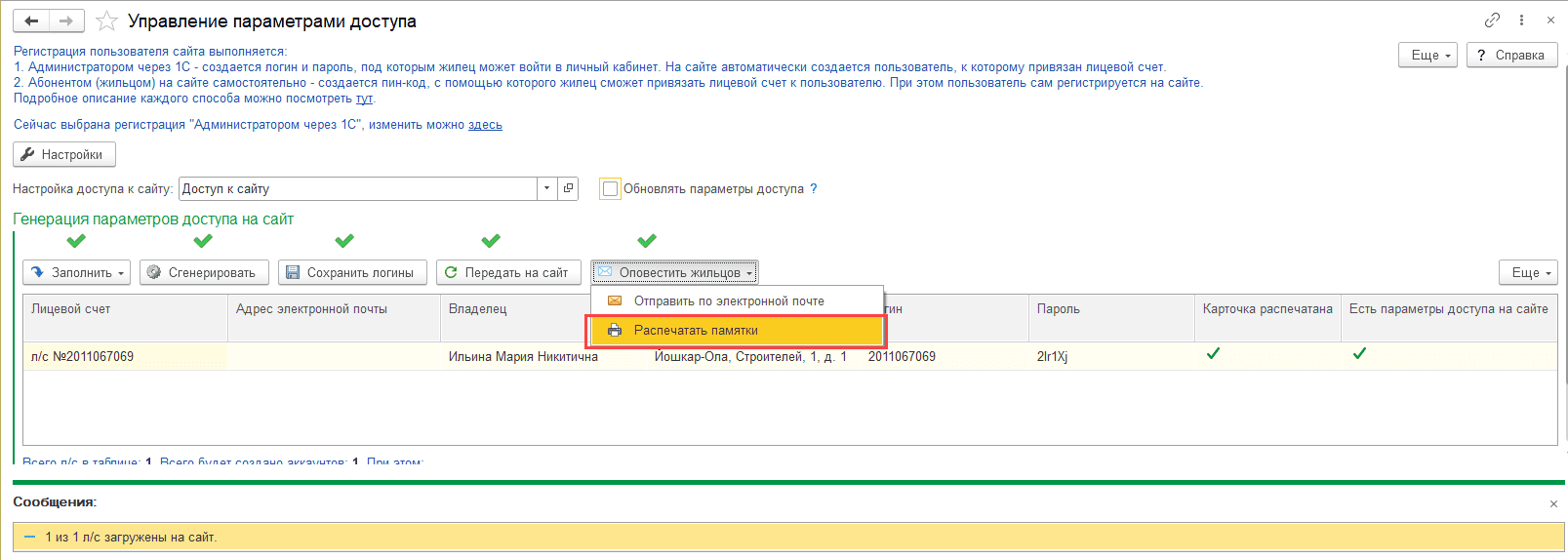 Шаг 2. После того как становится известно, что собственник один, в 1С указываем реальную почту для лицевых счетов и запускаем обработку «Управление параметрами доступа»: