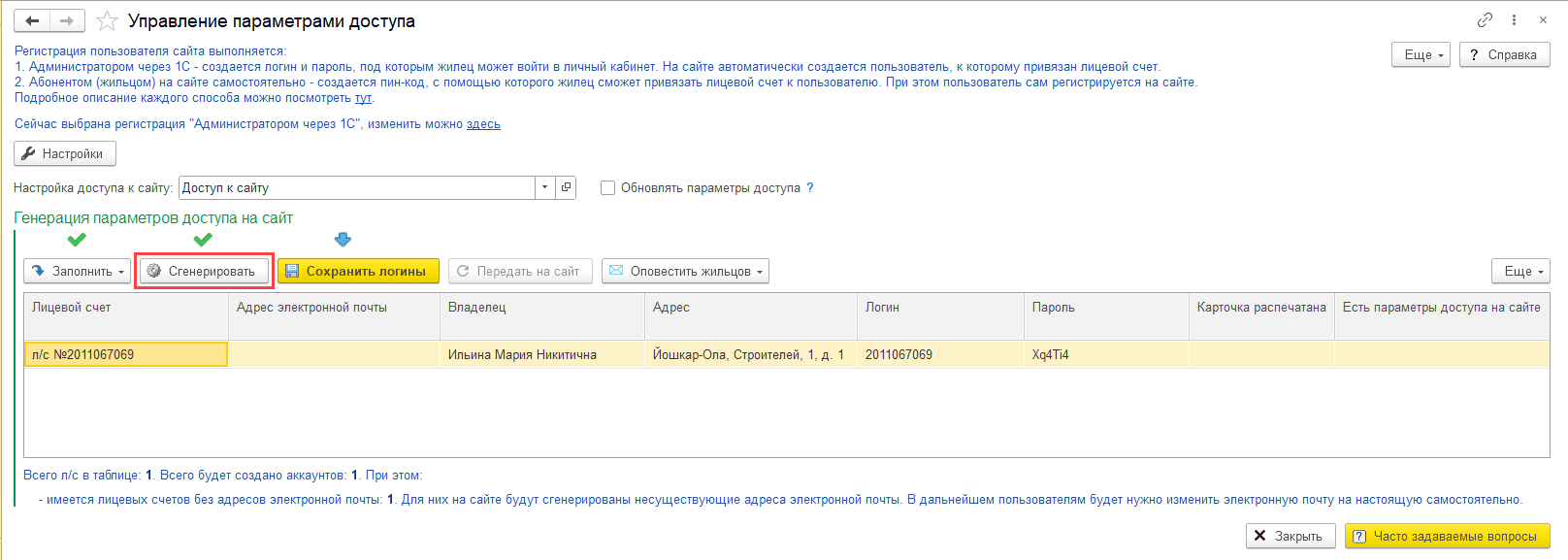 При установке флажка «Обновлять параметры доступа» для лицевых счетов будут сгенерированы новые пароли, логин останется тот же. Это может потребоваться, когда жители забыли ранее выданный пароль или изменился собственник квартиры.
