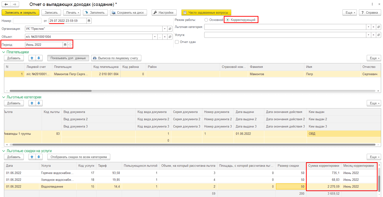 В корректирующий отчет попадут данные из Расчета льгот, если документ был проведен в месяц формирования отчета, но и при этом только за тот период, который указан в документе «Расчет льгот». Например, если отчет заполняется в июле, то документ «Расчет льгот» должен быть проведен также в июле, а периоды, за который проведен документ и формируется отчет должны совпадать