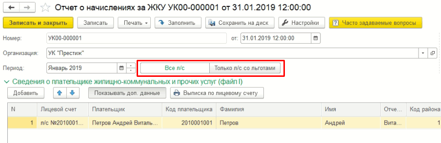 Заполнять отчет можно всеми лицевыми счетами или только лицевыми счетами со льготниками. Для этого выбираем нужный вариант в шапке документа: