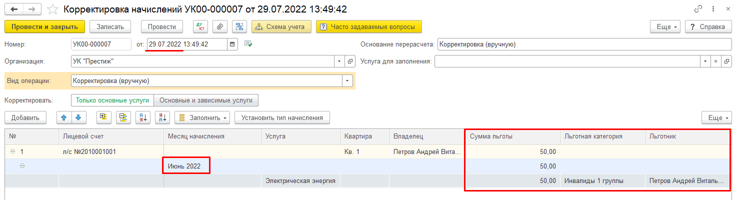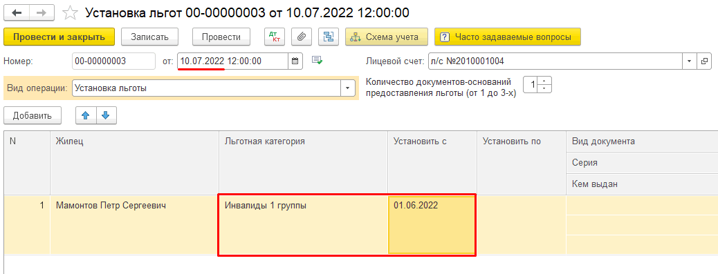 Отразим установку или продление льготы документом «Установка льгот». Например, предположим, что жилец лицевого счета л/с №2010001004 принес справку о том, что с июня 2022 г. ему положена льгота, только в июле: