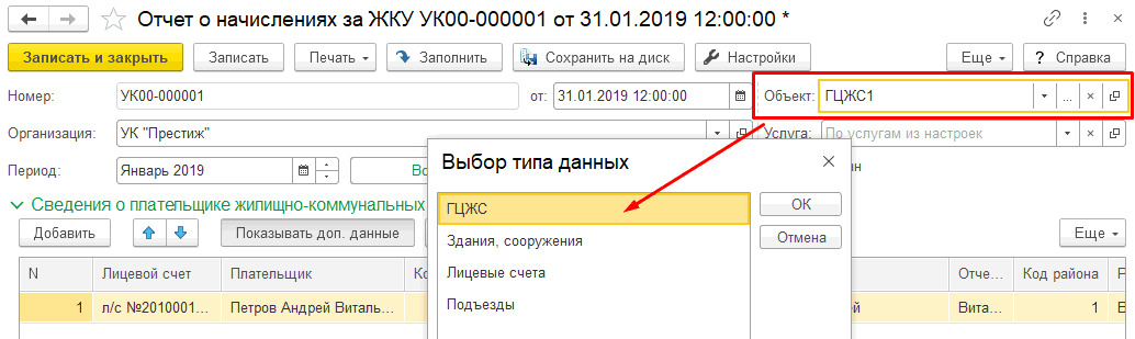Объект – здание, лицевой счет или подъезд, по которому заполняются данные. Если объект не выбран, данные заполняются по всем имеющимся лицевым счетам;