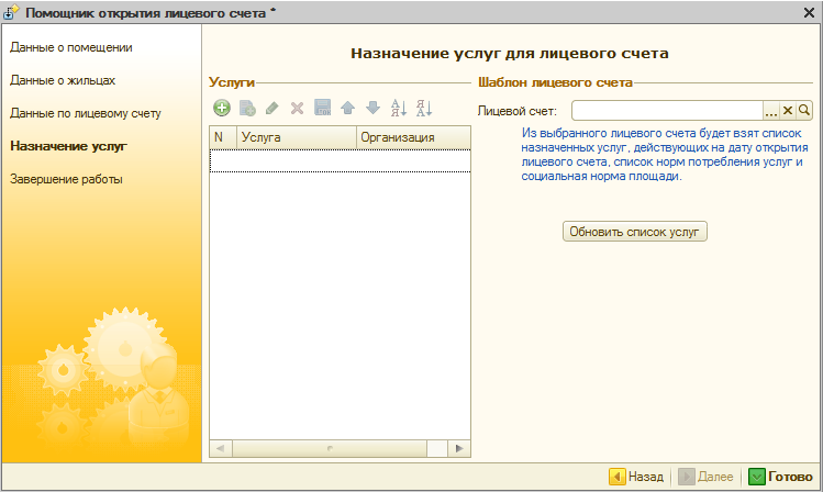 Далее в помощнике открытия лицевого счета можно назначить необходимые услуги: