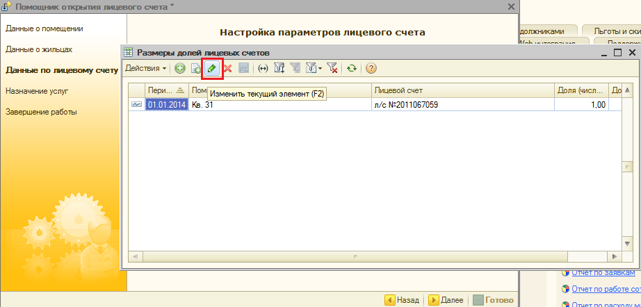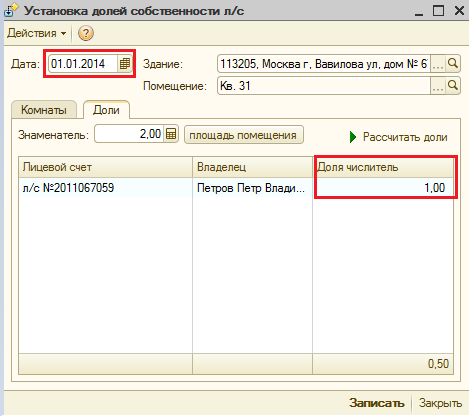 В поле «Дата» указываем дату открытия нового лицевого счета, в примере оба лицевых счета открываются в один день, поэтому дата не меняется. На закладке «Доли» перераспределяем доли собственности ранее открытого лицевого счета с учетом доли нового лицевого счета: